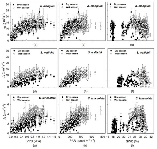 Raw data of daily (including daytime and nighttime) sap flux density (Js ± standard error) to average vapor pressure deficit (VPD) at (a) A. mangium site, (d) S. wallichii site, (g) C. lanceolata site; photosynthetically active radiation (PAR) at (b) A. mangium site, (e) S. wallichii site, (h) C. lanceolata site; and soil water content (SWC) at (c) A. mangium site; (f) S. wallichii site; (l) C. lanceolata site in the dry and wet seasons. (note that the y-axis of C. lanceolata has a different scale compared with that of the other two species).
