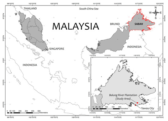The Balung River Plantation is in the northeastern part of Tawau City (40 km from the city) with a total land area of approximately 1500 hectares and located between N 04° 26’ 18.50” latitude and E 118° 02’ 55.90” longitude, as shown in the map (Figure 1). The plantation area has relatively plain lands surrounded by hills with an elevation ranging from 300 to 470 m above sea level. The mean annual temperature of the study area was high year round ranging from 24 to 33° C and the average yearly rainfall ranging between 1800 to 2500 mm. Geologically, the study area has experienced active volcanic activity involving lava flows and pyroclastic deposits in which the study area is widely distributed with volcanic rock consisting of basalt and andesite [32]. According to the Soil Taxonomy Classification System (USDA), the soil at the study site is classified as Typic Haplodult. The type of soil texture is clay loam and clay along with 38% to 77% of clay content.