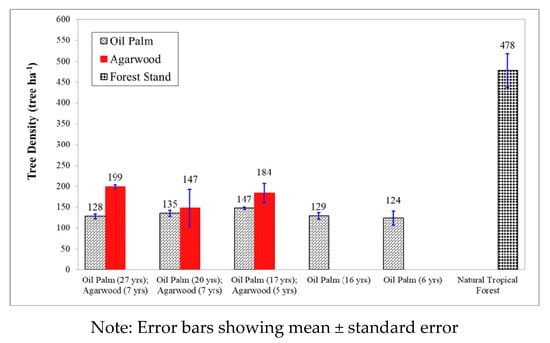 Our result showed that the tree density varied among the different land uses. The natural tropical forest has the highest tree density which reflects a randomly distributed pattern of trees growing in the forest ecosystems. On the contrary, the tree density for the trees in the plantation system was influenced by the planting distance applied on the site. Oil palms were planted at 9 × 9 m distance in both agroforestry and monoculture. For agarwood trees, they were planted at 4 × 9 m distance. For the tropical forest, measurement was taken only for the trees with DBH >10 cm and above. The tree density in Figure 2 was based on tree/ha unit in order to make it comparable between the different land use systems. Different plot sizes were used in this study, because using a smaller plot size (30 × 30 m) in the plantation area resulted in only a few oil palm trees measured (less than 10 trees per plot). Thus, the plot size was expanded to 50 × 50 m in order to get an optimal number of oil palm trees for above ground carbon stock measurement.