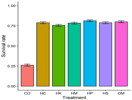 Different survival rates for all species at all sites over the studied period under different hydrogel treatments and control. According to multiple proportion test, CO is significantly different than any hydrogel treatment, whereas different hydrogel treatments do not differ significantly. N = 1080 for each treatment.