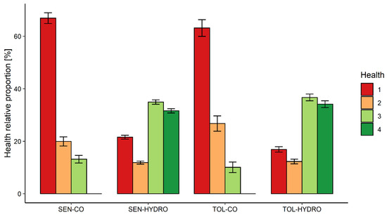 Relative proportion of health category within drought-tolerant (TOL) and drought-sensitive (SEN) species with (HYDRO) or without (CO) hydrogel treatment (all treatments with hydrogel addition together). Health = 4 denoting healthy plant and health = 1 denoting dying plant. NTOL-CO = 228; NTOL-HYDRO = 1365; NSEN-CO = 532; NSEN-HYDRO = 3192; SE indicated as error bars.