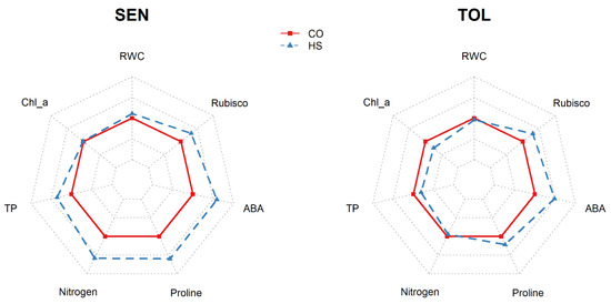 Spider-plot of biochemical variables in drought-tolerant (TOL) and drought-sensitive species (SEN) with (HS = hydrogel + subsoil) or without (CO) hydrogel. Values are displayed relative to respective CO treatment, and each concentric segment of a web denotes a 10% difference in the given parameter.