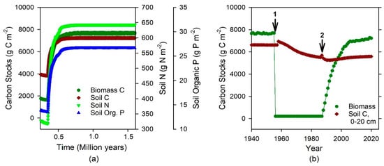 Baseline spin-up of Century model simulations of biomass C and soil C, N, and P (0–20 cm) stocks for La Selva Biological Station, Costa Rica. (a) Mature forest development over 1.5 million years. (b) Land-use changes appended to baseline are denoted by arrows. (1) Mature forest was felled and burned in 1955, pasture grass planted and pasture was grazed. (2) Pasture was abandoned in 1987, grass was cut and mulched, and experimental trees were planted in mono-dominant plantations in 1988. Results here depict the same tree species, ‘mature forest’ (La Selva Mature, LSM, as in Table S2), modeled both before deforestation and during the experimental plantation period.