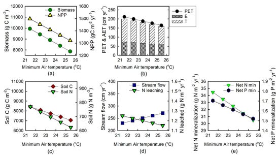 We focused on specific scenarios of climate change that have been observed in this site; trends of increasing night-time temperature (Tmin) and decreased drier-season rainfall are predicted for Central American forests in general [,]. Of these two scenarios, increasing Tmin had the greatest effect on simulated ecosystem processes (Figure 2). The increase in the minimum temperature generally reflects an increase in atmospheric moisture, which usually causes a reduction in PET. The reduction in the difference between the maximum and minimum temperature is also correlated with a reduction in PET []. Thus, Century uses the difference between the minimum and maximum temperature to calculate PET, which is high in deserts and low in tropical forests due to atmospheric water levels. Modeled NPP declined with increasing Tmin because the narrower difference between Tmax and Tmin led to a reduction in PET and AET (Figure 3b), which is essentially a surrogate for vapor pressure deficit (VPD) in Century. Consequently, this reduced productivity. Similarly, others [] found that annual NPP correlated most with AET. With NPP declining as a result of lower AET, relatively less organic C was transferred to soil, thereby reducing N and P mineralization rates as Tmin increased. Also, as AET declined, streamflow increased, driving slight increases in P loss in streamflow. In their analysis of factors limiting productivity in Hawaiian forests, Raich et al. [] found that modeled leaching losses of P increased over time of soil genesis, driving a concomitant decline in ANPP in P-limited forests. At La Selva, although leaching loss of P increased by only 1% as Tmin increased, that loss may have been enough to depress productivity, given the relatively high P limitation in this soil type.
