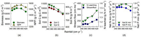 Drier period in January–May. By decreasing drier-season rainfall, simulated annual rainfall declined 15% over the range of experimental runs. At the experimentally highest rainfall, i.e., ‘normal’ MAP of 420 cm, biomass was lowest (Figure 3a). It increased by 6% to peak at the intermediate rainfall level of 376 cm yr−1, and then biomass declined by 4% as rainfall decreased to the lowest level. Soil C and N both declined monotonically by 16% across the range of increasing rainfall (Figure 3b). The experimental rainfall reduction was during the drier part of the year; nonetheless, streamflow decreased by 16% as rainfall declined by 17% (Figure 3c). N leaching declined by 16%, with leaching increasing relatively more at higher rainfall. Nutrient availability trends were similar to those of biomass in that net N mineralization peaked at intermediate rainfall levels, and then declined by 3% as rainfall increased (Figure 3d). P mineralization declined 4% as rainfall increased, but this process is less influenced by biological controls in Century, and was relatively constant under drier conditions.