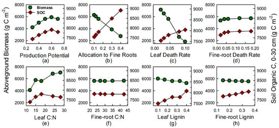 Regarding tissue chemistry traits, with increasing leaf C:N aboveground biomass increased by 72%, SOC by 18% (Figure 4e), and ANPP by 34% (Figure 5e). Both SOC and ANPP peaked at intermediate values. In contrast, with increasing fine-root C:N aboveground biomass and SOC increased by <1% (Figure 4f) and ANPP by 3% (Figure 5f). With increasing leaf lignin, aboveground biomass declined by 12% while SOC increased by 8% (Figure 4g); ANPP decreased by 10% (Figure 5g). Fine-root lignin had a trend similar to leaf lignin, but the effect was smaller, with all three output variables varying by only 3% across the range of simulated values (Figure 4h and Figure 5h).