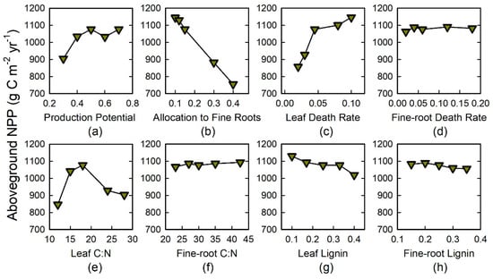 Sensitivity analyses to evaluate effects of traits of tree species on aboveground NPP. Plant traits included: (a) production potential; (b) allocation to fine roots; (c,d) leaf and fine-root death rate; (e,f) leaf and fine-root C:N; and (g,h) lignin content. The middle value corresponds to input data for ‘LSM’, La Selva mature forest.