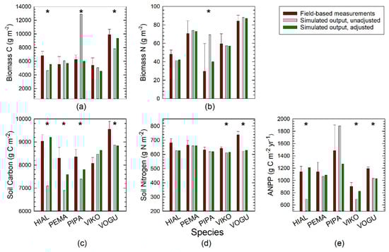 Comparison of measured and simulated effects of five tropical tree species on ecosystem processes and properties. (a,b) Aboveground biomass C and N. (c,d) Soil organic C and N (0–30 cm). (e) Aboveground net primary productivity (ANPP). Four-letter acronyms for tree species at La Selva are given in the text. Measured values (means ± standard error, n = 4) are based on the years 2003–2005 of the long-term, field-based experiment [,]. An asterisk denotes that uncalibrated simulated values fell outside of the 95% confidence interval of measured values.