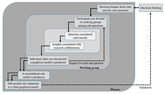 Diagram of a four-stage protocol for eliciting expert knowledge when designing the decision for different conditions and pressure indicators of riparian zones in the Three Gorges Dam Reservoir, China. In the first phase, the decisions of the whole group on different conditions and pressures of riparian zones of the TGDR were divided into specific sub-questions. In the second phase, participants were divided into working groups to deal with different issues. In the third stage, the model produced by the working group was assimilated into a standardized model, one per preliminary sub-question. In the fourth phase, the integrated sub-model was assimilated into a conceptual model.