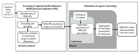 In order to design an effective evaluation model applicable to the riparian areas of the TGDR, we consulted with a number of experts to evaluate and identify parameters (such as condition and pressure indicators) while reviewing a large quantity of relevant literature. The most pertinent experts were selected, and multiple meetings were carried out with the representatives of the reservoir management unit, immigration management office, local township, and local communities. During this consultation process, various field visits to the riparian zones of the TGDR were made, which took almost six months before the decision session. The steps in the process of designing a model structure through experts were according to a four-stage program proposed by Lanzanova et al. [49] and Whitney et al. [50] (Figure 2). The final conceptual model represents a path of significant decisions that can be formally designed and implemented.