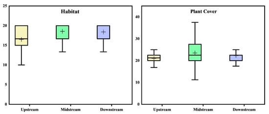 Box and whisker plots for riparian health indicators and pressure indicators measured at upstream, midstream and downstream transects in the Three Gorges Dam Reservoir, China. The y-axis denotes the total score (%). The black horizontal line represents the median, whereas the plus sign symbolizes the mean. The boxes represent the 25th–75th percentiles, and the whiskers outside the boxes represent the 10th–90th percentiles. The circles beyond the whiskers represent an outlier, whereas the asterisks beyond the whiskers mean extreme cases from the upper or lower edge of the box. Note: significant at p <0.05 of the Kruskal-Wallis test.
