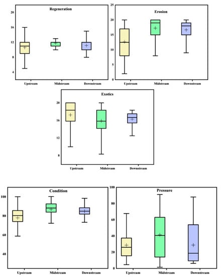 As shown in Table 3, there was a significant difference across the three zones regardless of the index (all p < 0.01 with an exception of PC at p < 0.05) in the TGDR. Thus, Box and whisker plots were used to compare the RHIs and pressure indicators (Figure 4). Results showed that upstream transects had the lowest mean relative habitat status as compared to midstream and downstream transects in riparian zones of the TGDR. For plant cover, both the lowest as well as the highest mean status were observed in the midstream riparian transects. These riparian zones were also inconsistent as compared to the upstream and downstream, which were relatively more suitable to predict riparian zone conditions. Furthermore, the lowest and also the highest mean relative regeneration status were observed in the upstream riparian zones, and these zones were inconsistent in status as well. However, relative consistency was observed in the status of midstream zones, which had a higher prediction ratio about riparian zone status. In parallel, all zones had similar highest mean relative erosion status, which is alarming from erosion perspective. The lowest mean relative status was estimated in the upstream riparian zones. Whereas, relative consistency was assessed in the downstream riparian zones. Similarly, higher inconsistency in status was noticed in the exotic mean relative status of riparian zones in the whole TGDR. Even so, these zones had almost similar highest mean relative condition status, but were having differences in lower mean relative condition status. Relative consistency was assessed in the downstream riparian zones, whereas relative inconsistency was displayed in the upstream. Box and whisker plot results were compelling for the mean relative pressure status of TGDR riparian zones. The significant differences in the relative mean and median were seen in all zones and their subsets. By comparing between three zones, relatively higher inconsistency was measured in the midstream, whereas relative consistency was recorded in the upstream riparian zones.