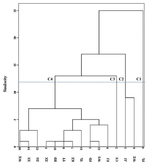AHC analysis identified four groups of counties with a high level of similarity. The first group, indicated as C1 in Figure 5, included only upstream (20) transects. The second group, specified as C2, comprised of upstream and midstream transects, and the majority of transects belonged to midstream areas (20 out of 25). The third group contained transects (8) only from the upstream area again and designated as C3. Remaining all transects fell under group four, indicated as C4 (Figure 5).