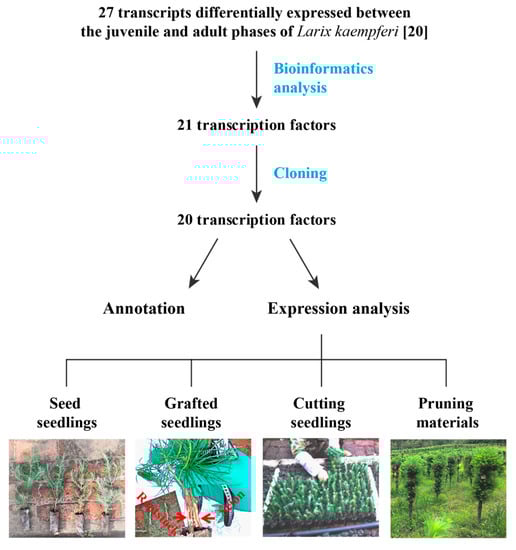 Here, we analyzed 27 age-related transcription factors again, cloned their full-length cDNA sequences, and measured their responses to grafting, cutting, and pruning to (1) determine if they can be used as molecular markers to determine the state of L. kaempferi trees treated with these horticultural techniques, and (2) study the molecular mechanisms of rejuvenation (Figure 1).