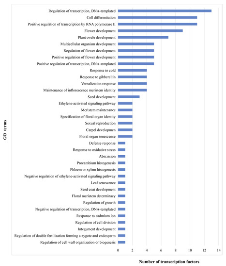 Biological processes in Gene Ontology (GO) terms. Based on the results of blast analysis, the GO terms associated with the Arabidopsis thaliana homologs were assigned to the Larix kaempferi transcription factors.