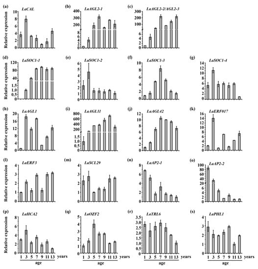 The qRT-PCR assays were used to reveal the expression patterns of the 20 transcription factors in 1-, 3-, 5-, 7-, 9-, 11-, and 13-year-old trees. We found that the expression level of LaAP2-2 decreased with age (Figure 3o), while that of LaAP2-1 decreased, and that of LaOZF2 increased from 1 to 5 years (Figure 3n,q) and the expression levels of LaAGL2-1, LaAGL2-2, LaAGL2-3, LaSOC1-1, LaSOC1-3, LaAGL11, and LaAGL42 increased from 1 to 7 years, while almost no changes were found in the expression levels of LaAGL2-1, LaAGL2-2, LaAGL2-3, LaSOC1-1, LaAGL11, and LaAGL42 from 7 to 13 years and a decrease occurred in the expression level of LaSOC1-3 (Figure 3).