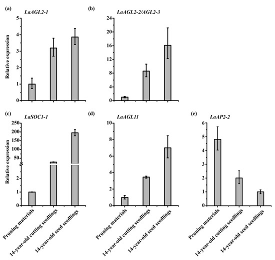 Expression patterns of LaAGL2-1 (a), LaAGL2-2 (b), LaAGL2-3 (b), LaSOC1-1 (c), LaAGL11 (d), and LaAP2-2 (e) in 14-year-old Larix kaempferi pruning materials (n = 3, sampled in 2018), cutting seedlings (n = 3, sampled in 2018), and seed seedlings (n = 3, sampled in 2018) assayed by qRT-PCR with LaFBP1 as the internal control.