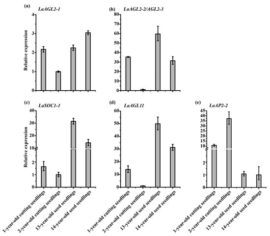 Expression patterns of LaAGL2-1 (a), LaAGL2-2 (b), LaAGL2-3 (b), LaSOC1-1 (c), LaAGL11 (d), and LaAP2-2 (e) in 1- and 2-year-old Larix kaempferi cutting seedlings (n ≥ 12, sampled in 2019) and 13- and 14-year-old seed seedlings (n ≥ 6, sampled in 2019) assayed by qRT-PCR with LaFBP1 as the internal control. In 2018 and 2017 1- and 2-year-old cutting seedlings were propagated from 12-year-old seed seedlings that were sampled in 2019 when they were 13- and 14- years old, respectively.