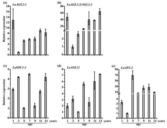 Expression patterns of LaAGL2-1 (a), LaAGL2-2 (b), LaAGL2-3 (b), LaSOC1-1 (c), LaAGL11 (d), and LaAP2-2 (e) in 1-, 3-, 5-, 7-, 9-, 11-, and 13-year-old Larix kaempferi cutting seedlings (n ≥ 5, sampled in 2019) assayed by qRT-PCR with LaFBP1 as the internal control.