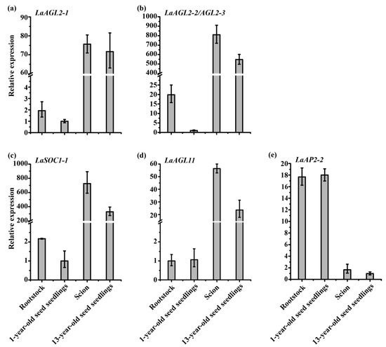 Expression patterns of LaAGL2-1 (a), LaAGL2-2 (b), LaAGL2-3 (b), LaSOC1-1 (c), LaAGL11 (d), and LaAP2-2 (e) in 3-month-old grafted seedlings (n = 6, sampled in 2019) and 1- and 13-year-old seed seedlings (n = 11, sampled in 2019) assayed by qRT-PCR with LaFBP1 as the internal control.