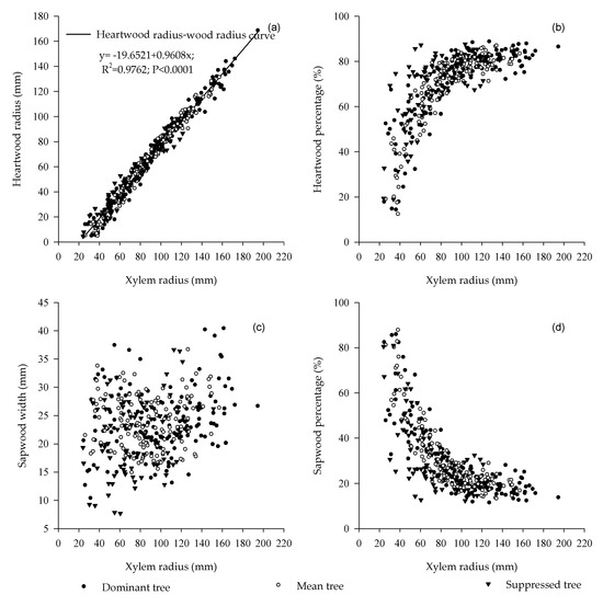 Relationship between xylem radius and (a) heartwood radius, (b) percentage of heartwood radius, (c) sapwood width and (d) percentage of sapwood width.