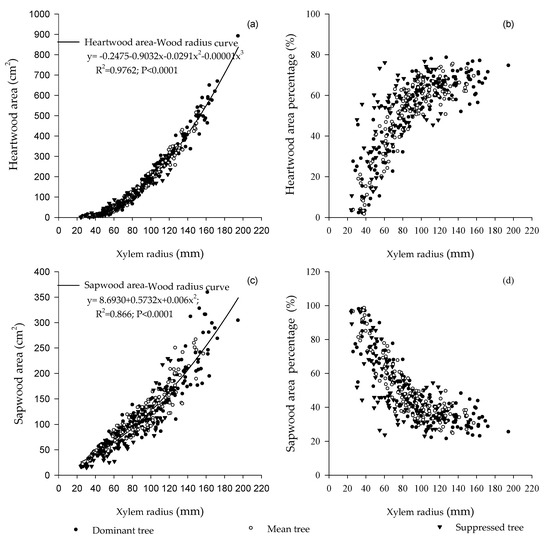Relationship between xylem radius and (a) heartwood areas, (b) percentage of heartwood areas (c) sapwood areas and (d) percentage of sapwood areas.