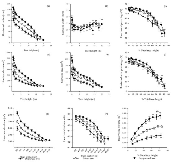 Vertical variations of (a) heartwood radius, (b) sapwood width, (c) percentage of heartwood radius, (d) heartwood area, (e) sapwood area, (f) percentage of heartwood area, (g) heartwood volume, (h) ratio of heartwood volume and (i) cumulative heartwood volume with increasing tree height or relative tree height.