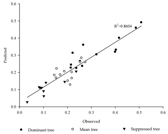 Tree growth characteristics were significantly correlated with heartwood radius and area at breast height, and individual heartwood volume. DBH had the highest correlation, followed by tree height, crown width and height to crown base. The sapwood area was significantly correlated with DBH and tree height, while sapwood width was only correlated with DBH (Table 4). Due to the fact that DBH had the closest relationship with heartwood and sapwood properties, and is the easiest and most accurate factor in individual measurement during forest inventory, the DBH of the 34 sampled trees was thus chosen to fit the individual heartwood volume (Figure 5). Based on model statistical evaluation (Table 5) and paired-T test (Figure 6, Table 6), it was shown that the heartwood volume of T. grandis could be accurately estimated by the model (R2 = 0.8601).