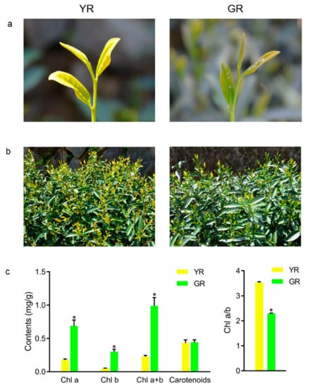 Phenotype and pigment contents of green-leaf cultivar Rougui (GR) and its yellow-leaf mutant (YR). (a) Leaf color changes between yellow-leaf mutant YR and its original cultivar GR. (b) Performance of YR and GR in the field. (c) Chl a, Chl b, Chl a + b, and total carotenoid contents and the Chl a/b ratio of young shoots with one bud and two leaves from YR and GR. Error bars indicate the standard error of the mean (n = 3). Student’s t test was employed and asterisks indicate significant differences between YR and GR (p < 0.05).