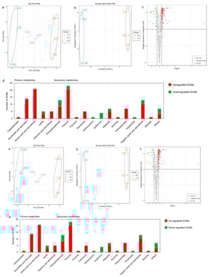 Referring to previous methods [20,21], we identified metabolites by comparing the fragmentation patterns, the retention time, and the accurate m/z value to the standards in the self-compiled database (MetWare, Wuhan, China) [20] and the public databases. Principle component analysis (PCA) and orthogonal partial least squares discrimination analysis (OPLS-DA) of identified metabolites were performed using the R package (https://www.r-project.org/). Based on the variable importance in project (VIP) score obtained by the OPLS-DA model [25], metabolites with VIP ≥ 1.0, fold change ≥ 1.5 or fold change ≤ 0.67, and p-value ≤ 0.05 were defined as significantly changed metabolites (SCMs).