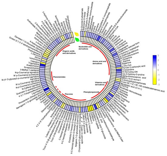 To more clearly observe the fold changes in the SCM levels of YR and GR, TBtools [33] was used to generate a heat map of 130 SCMs (Figure 3), with blue representing elevated levels of metabolites and yellow representing decreased. Fourteen nucleotides and derivatives were found to be differentially accumulated in YR and GR, 13 of which were significantly increased in YR, including adenosine, guanosine, cytidine, uridine, and 1-methylxanthine, while the level of 5,6-dihydro-5-methyluracil was decreased. Amino acids and their derivatives influence the flavor and aroma of tea. Compared with the young shoots of GR, 20 of the 21 significantly changed amino acids and their derivatives were increased in YR, including l-serine, l-leucine, l-threonine, l-histidine, l-isoleucine, l-(+)-arginine, l-homoserine, l-asparagine, l-alanine, l-glutamine, and glutathione, and pyrrole-2-carboxylic acid was decreased. The levels of all significantly changed vitamins and their derivatives were increased in YR, especially l-ascorbate, which was a 2.05-fold increase. Thirteen SCMs belonged to phenylpropanoids, and eight of these were markedly increased in YR, especially cinnamic acid and trans-cinnamic acid, which were increased by 3.85 and 4.49-fold, respectively. Of the 23 significantly changed flavones, 19 showed markedly higher abundances in YR than those in GR, including 6-c-hexosyl-hesperetin o-hexoside, 3’,4’,5’-tricetin o-rutinoside, luteolin c-hexoside, apigenin c-glucoside, and isohemiphloin. Interestingly, seven significantly changed phenolamides were markedly elevated in YR. Organic acids and derivatives also affect the tea taste and aroma. Compared to GR, 13 organic acids and derivatives were detected to be significantly changed in YR, including 10 increased and 3 decreased. The most decreased was benzyl salicylate, which was decreased almost 2-fold.
