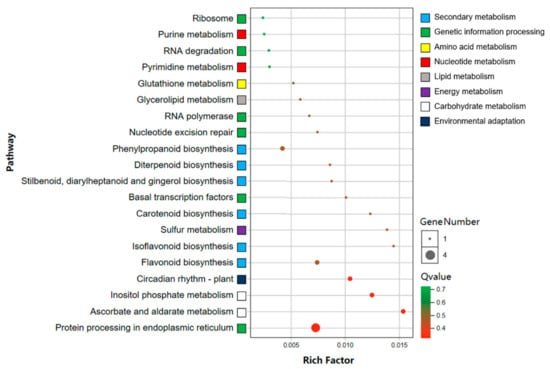 To identify differentially expressed genes (DEGs) between the young shoots of YR and GR, a transcriptomic comparison was carried out. As shown in Table 1, a total of 46.36–64.35 million raw reads were obtained, and the Q30 of the raw reads ranged from 93.98% to 94.47%, indicating the high quality of the transcriptome data. A total 41.28–57.38 million reads were mapped to the tea plant genome (http://tpia.teaplant.org/index.html) [1] with an alignment efficiency in the range of 89.57%–90.28%. All transcriptome data sets were stored in the NCBI SRA database under the accession number PRJNA561281. A total of 55 DEGs, including 37 upregulated and 18 downregulated genes, were identified in the young shoots of YR compared to GR (Supplementary Table S3). GO enrichment analysis showed that DEGs were divided into three major categories and 26 subcategories (Supplementary Figure S1). In the biological process aspect, “metabolic process” and “cellular process” were the top enriched terms, whereas in the cellular component aspect, most of the DEGs were enriched in “cell” and “cell part”, and in the molecular function aspect, most of the DEGs were participants in “binding” and “catalytic activity”. Pathway analysis indicated that DEGs were enriched in 26 KEGG pathways. The top 20 pathway enrichment analyses indicated that most of the identified DEGs act on multiple metabolic processes related to energy metabolism, amino acid metabolism, nucleotide metabolism, lipid metabolism, carbohydrate metabolism, and secondary metabolism (Figure 4). The pathways annotated by these DEGs were closely related to the classification of SCMs, indicating that these mRNAs regulate the changes in the abundance of metabolites of young shoots between YR and GR.
