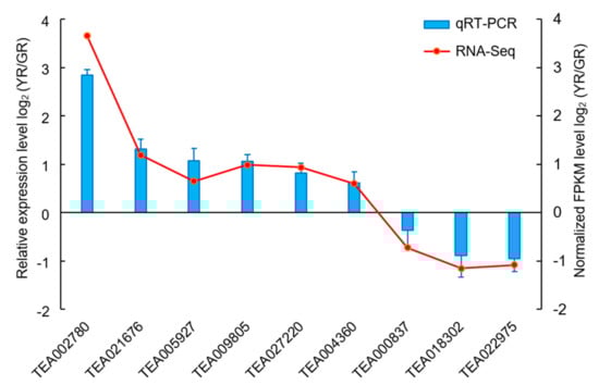 The reliability of the transcriptome data was further verified by random selection of nine DEGs for qRT-PCR analysis (Figure 5). The results indicated that the expression patterns from qRT-PCR testing were well correlated with sequencing results.