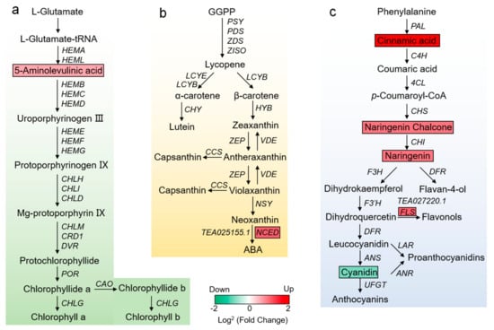 In carotenoid metabolism, although there was no significant difference in total carotenoid content between YR and GR, the carotenoid composition may vary and influence leaf coloration. Interestingly, a 9-cis-epoxycarotenoid dioxygenase encoding gene (NCED, TEA025155.1), the rate-limiting enzyme that controls the conversion of carotenoids to ABA, was upregulated 1.88-fold in YR (Figure 6b), which might regulate carotenoid degradation.