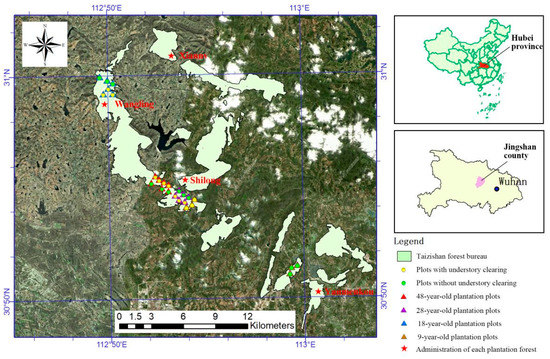 The study was conducted in the Taizishan forest bureau (112°48′45″–113°03′45″ E, 30°48′30″–31°02′30″ N). It’s located in Jingshan county, Hubei province, central China. There are four plantations in this area: Shilong, Wangling, Xiannv, and Yanmenkou forest farms. These plantations are discontinuously distributed in this area (Figure 1). Taizishan is in a subtropical monsoon humid climate zone. The summer and autumn represent the rainy season, and there is drought in the winter and spring seasons. The annual average temperature is 16.4 °C, and January is the coldest month with an average temperature of 2.6 °C. The extreme minimum temperature on record is −19.6 °C. The frost-free period spans 240 days. July is the hottest month, with an average temperature of 28.8 °C, and the extreme maximum temperature on record is 39.2 °C. The annual average rainfall in this area is 1094.6 mm. Soil in this region is mainly yellow/brown soil with a typical soil depth of 40–60 cm.