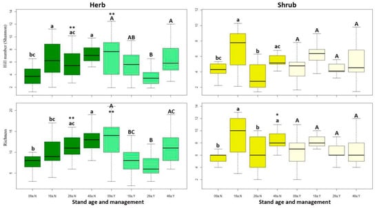 Differences in Hill number (Shannon) and richness of the herb and shrub layers among four stand ages. Y means the plots have understory clearing management and N means the plots have no understory management. Separation of means was determined by a Tukey test where applicable. The letters indicate groups that are significantly different at p < 0.05. The lowercase letters indicate the group without understory clearing and the capital letters indicate the group with understory clearing. The “*/**” indicates a significant difference between understory treatments in same age class at p < 0.05 or p < 0.01 level.
