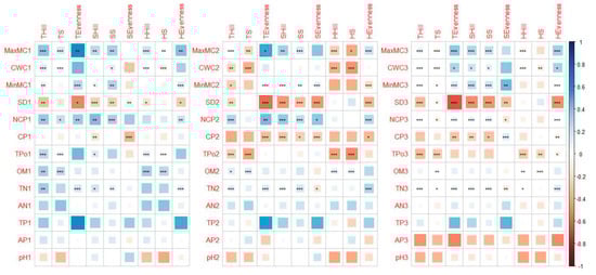 Correlation between soil properties in each layer and diversity index. In column header, the first letter indicates the category of the understory plants, and the following word/letter indicates the indices of the diversity. “T” indicates the total understory, “S” indicates the shrub layer, and “H” indicates the herb layer. “Hill” means the Hill number (Shannon), “S” means the species number, and “Evenness” means the evenness (Shannon). Plot A, B, and C represent layer 1, layer 2, and layer 3, respectively. The “*, **, ***” indicates the p values of 0.05, 0.01, and 0.001, respectively.
