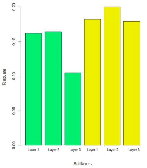We used the principal components of soil properties in each layer as the explanatory variables and the Hill number (Shannon) as the response to perform linear regression. Four principal components were extracted from the soil property data in each layer. The principal components could explain 85%, 79%, and 73% of the soil properties to the first, second, and third layer, respectively. The R2 of the linear regression were used to describe the strength of explanation (Figure 4). The results showed that the R2 of herb diversity marginally increased from layer 1 to layer 2, but it decreased in layer 3. The R2 of shrub diversity increased in layer 2 but decreased in layer 3. The second soil layer had the maximum R2 in both herb and shrub models, and the third layer had the minimum explanatory power for herb and shrub diversity. The soil properties might account for more of the diversity of shrubs, but they exhibited less explanatory power for herb diversity.
