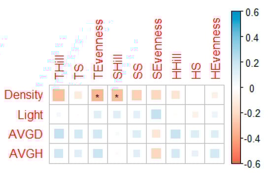 Moreover, we used a correlation analysis to test the relation between forest factors and diversity indices (Figure 5). We defined stand density (Densiy for short), light transmittance (Light for short), average DBH (AVGD for short), and average tree height (AVGH for short) as the forestry factors. The results of the correlation showed that only stand density had a significant negative correlation with total evenness and shrub Hill number (Shannon). The linear regression also showed that these forestry factors explain less than 0.05 (R2 = 0.0487) of the Hill number (Shannon).