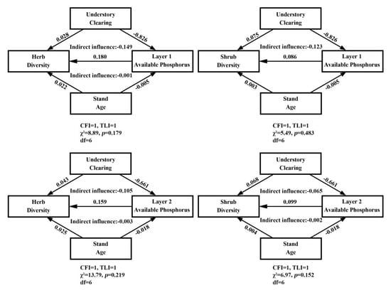 Structural equation modeling (SEM) for herb and shrub diversity. The understory management and stand age were fitted as direct pathways of influence on understory vegetation diversity, while the soil was fitted as indirect pathways of influence on understory diversity. We used CFI, TLI, and χ2 to estimate the fitness of the SEM models. The p is the p-value of the χ2 test, and the df is the degree of freedom of the model. The indirect influence from understory management was above the arrow and the indirect influence from stand age was below the arrow. The indirect influence was not shown if the absolute value of the coefficient was smaller than 0.001.