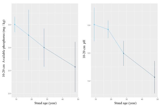 The change of AP and pH in second soil (10–20 cm) along stand age.