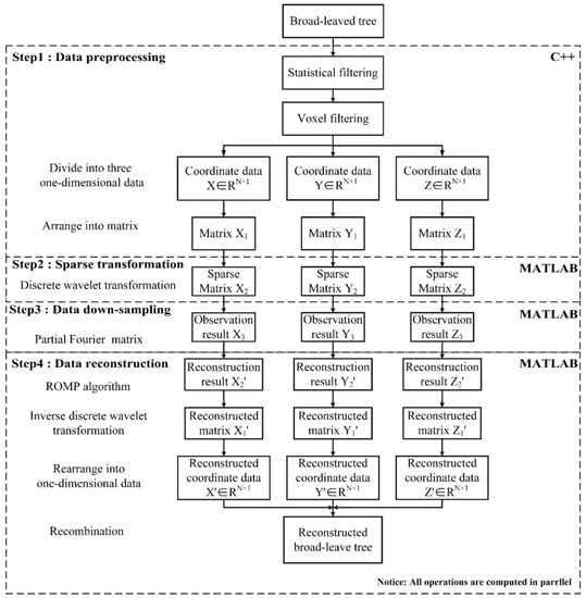 In this paper, a novel scheme based on compressed (PDF S1) sensing for acquiring broad-leaved tree point clouds is proposed. Firstly, voxel filtering and statistical filtering are employed to simplify point clouds and remove outliers, respectively. Secondly, the spatial coordinate data (XYZ) are divided into three one-dimensional data to be processed in parallel since compressed sensing is not able to process three-dimensional data directly. In addition, since the one-dimensional data is too large to be processed directly, it is arranged into matrix and processed by columns in parallel. A suitable sparse basis is selected for sparse representation of data according to the characteristics of broad-leaved tree point clouds, and partial Fourier matrix is applied to down-sample the sparse data due to its RIP (Restricted Isometry Property) [33,40]. Finally, the most suitable ROMP (Regularized Orthogonal Matching Pursuit) algorithm [41] is selected to reconstruct the data accurately.