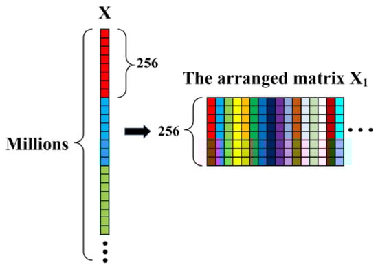 In the first step, voxel filtering and statistical filtering are applied to simplify the tree point clouds acquired from TLS and remove outliers. Due to the massive volume of tree point clouds, the observation matrix and the sparse transform matrix are very large and difficult to process. If the data is not arranged appropriately, direct computation will consume hundreds of gigabytes of memory. Furthermore, compressed sensing is based on one-dimensional data processing, and thus cannot be applied to 3D point clouds directly. Therefore, we first split the spatial coordinate data (XYZ) into three separate one-dimensional data and then arrange them into three matrices. Take X-coordinate as an example (Figure 3). Every points compose a column of the resulting matrix, namely, points compose the first column, points compose the second column and so on. Note that if the number of points in the last column is less than , the remaining elements are set to be zero. The procedure of preprocessing can greatly save time and memories. In this paper, N is set to 8 due to its superior performance.