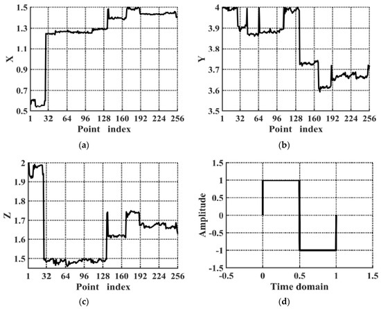 After data preprocessing, three spatial coordinate matrices , , are obtained. By observing each column of , , matrix, we find that most data have similar morphological characteristics: step-wise pattern (Figure 4a–c), which motivates us to apply DWT (Discrete Wavelet Transform) based on Haar wavelet (Figure 4d). The sparse matrix can be obtained by: