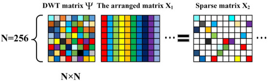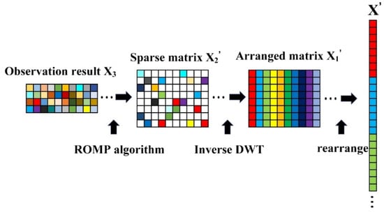 Since , the scale of observation result is much smaller than that of , which is convenient for storage and transmission. To recover the sparse matrix from , we apply the ROMP (Algorithm 1) provided that the observation result and observation matrix are known. By inverse DWT, the arranged matrix is computed. Finally, the arranged matrix is rearranged into one-dimensional data , which means the data reconstruction is completed (Figure 7). The inverse DWT is given by: