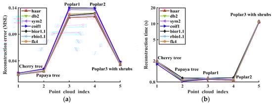As can be seen in Figure 8, the scheme based on the Haar wavelet consistently achieves the lowest reconstruction error with comparable reconstruction time as the other wavelet bases over multiple point clouds. It can thus be concluded that the Haar wavelet is a suitable sparse basis for broad-leaved tree point clouds.