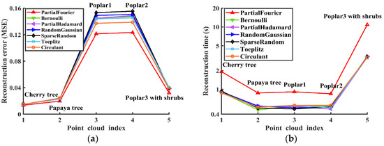 Figure 9 shows that the reconstruction errors of partial Fourier matrix are much smaller than those of other observation matrices. The improved accuracy, however, comes at the cost of doubling the reconstruction time. For broad-leaved trees, the reconstruction error has a significant impact on the preservation of tree morphological attributes. Therefore, as long as the computation time is acceptable, partial Fourier matrix is a better choice due to its high accuracy.