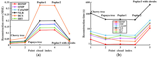 Lastly, we compare the ROMP algorithm with other reconstruction algorithms. From Figure 10, it can be observed that ROMP algorithm achieves lower reconstruction errors and it takes much less time than other algorithms. It only takes a few seconds on a 100,000-point point cloud and almost 15 seconds on a 1,000,000-point point cloud. Thus, it is reasonable to conclude that ROMP algorithm is superior in recovering broad-leaved tree point clouds.
