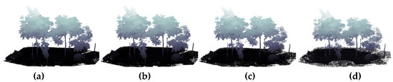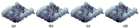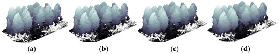 CS recovered Poplar 3 with shrubs point cloud with different compression ratios. (a) Compression ratio: 20%, (b) compression ratio: 40%, (c) compression ratio: 60%, (d) compression ratio: 80%.