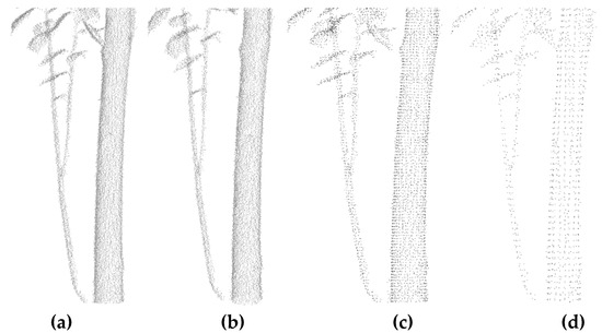 A terrestrial laser scanner (TLS) can provide three-dimensional (3D) co-ordinates of sampled points at a pre-defined sampling interval. They have high measurement accuracy and data acquisition efficiency, and are suitable for capturing large scenes with relatively low expenditure. TLS has been used to obtain 3D observations on tree surfaces to study morphological attributes [1,2,3,4,5]. However, the sampled data from TLS is very dense and with considerable redundancy. The vast volume of point clouds poses great challenges in real-time processing, storage, display, and transmission. Therefore, it is necessary to compress massive point clouds while maintaining a certain accuracy.
